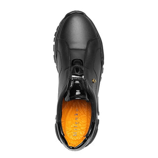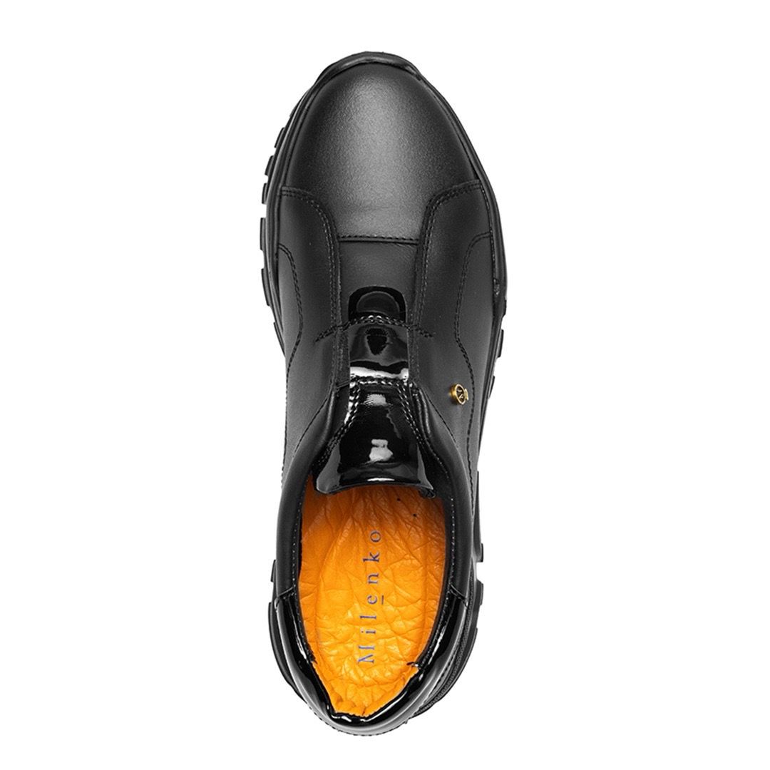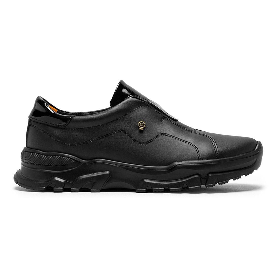 Slip-on de piel genuina negra en acabado mate, aplicaciones de charol en lengüeta y talón, aportando un contraste elegante y moderno.