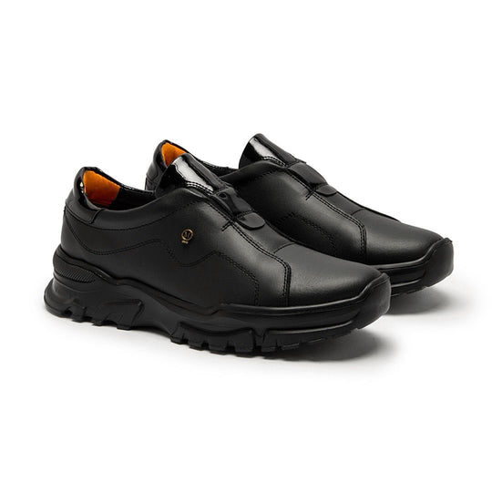 Slip-on de piel genuina negra en acabado mate, aplicaciones de charol en lengüeta y talón, aportando un contraste elegante y moderno.Interiores de forro de cerdo, plantilla anatómica elaborada con piel de res y suela tipo chunky...Precio regular $ 1,299.00 -